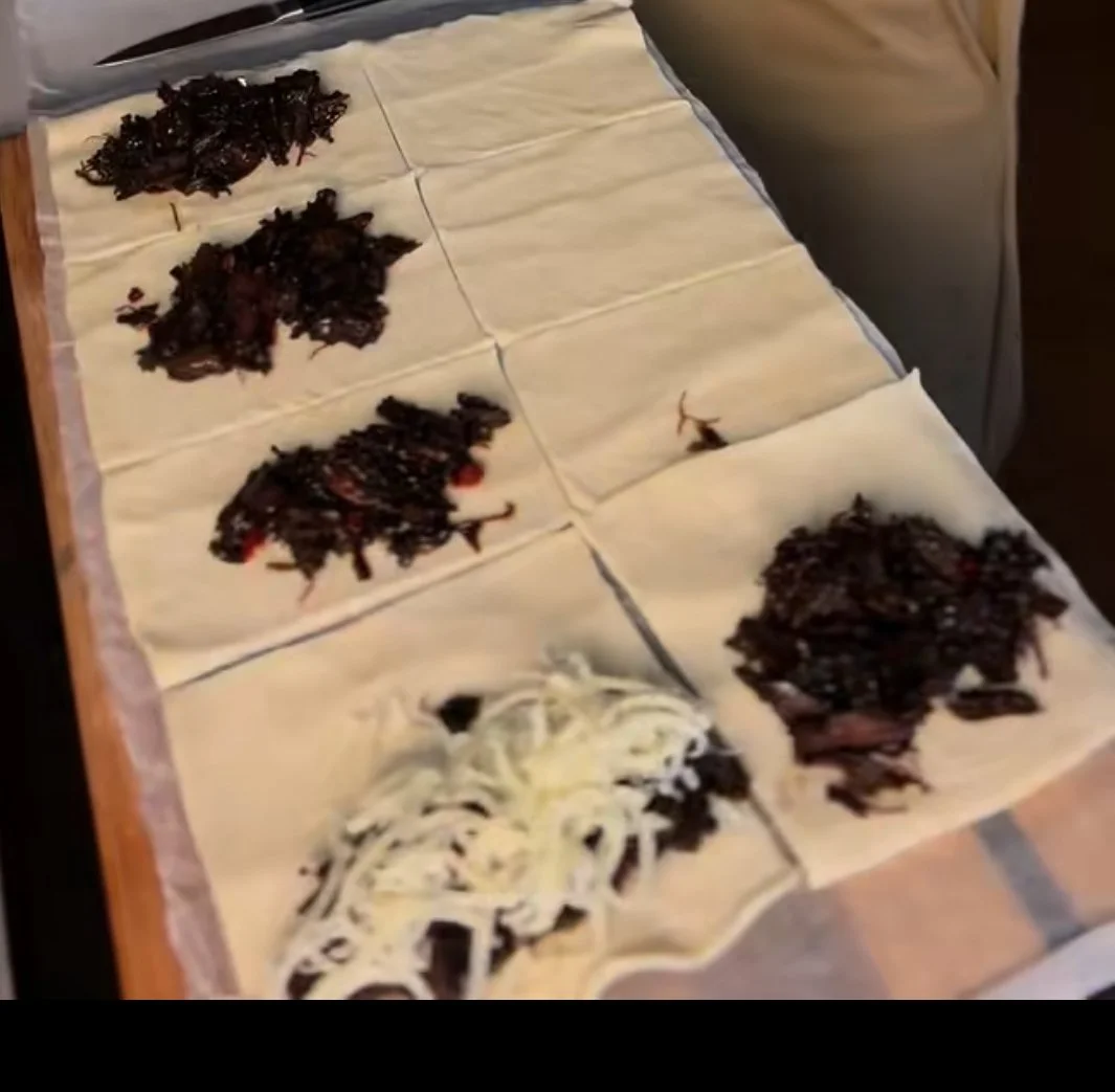 For each meat pie, use 2-3 tablespoons of oxtail meat and 2 tablespoons of mozzarella cheese as filling.